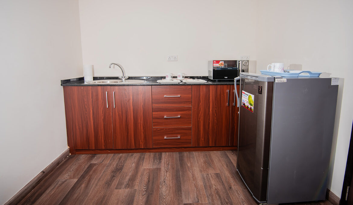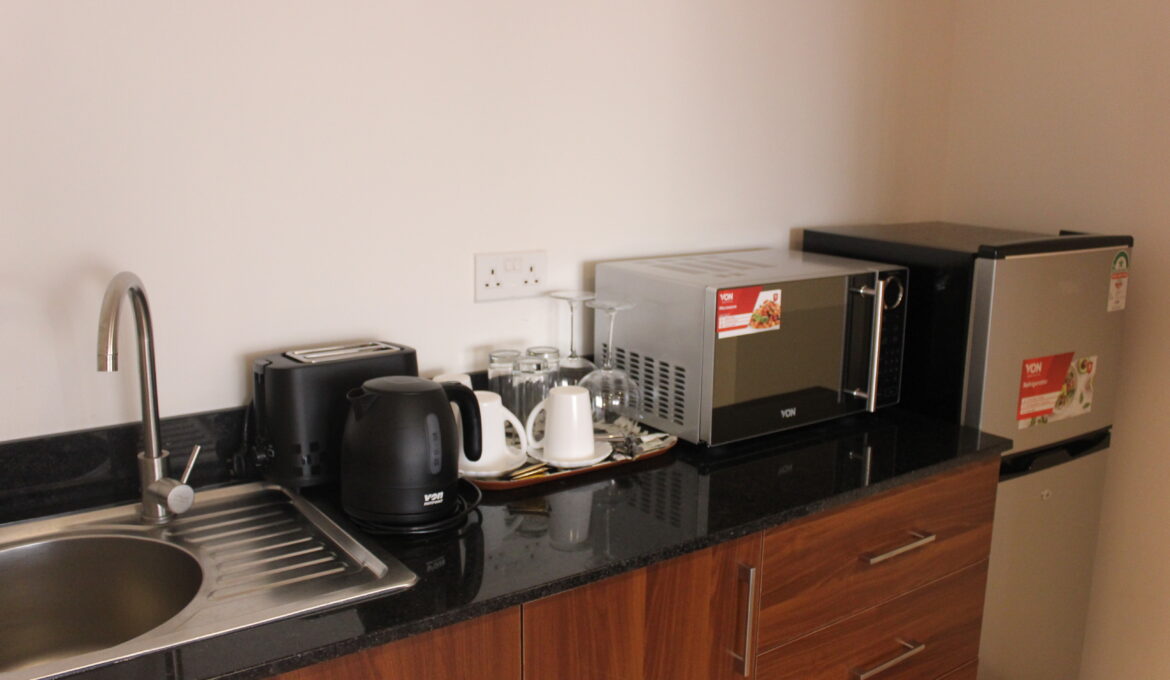 Kitchenette with Fridge, Microwave, Toaster, Kettle & Utensils